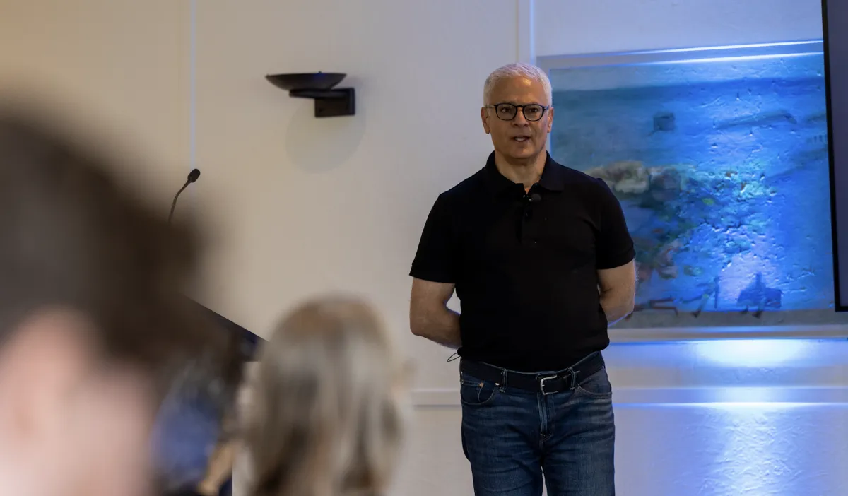 Image details: Frank Vella presenting on stage at Howard Smith Wharves in Brisbane.
