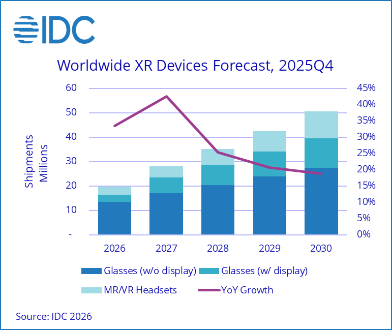 IDC expects the transition to continue through 2026. It forecasts XR shipment growth of 33.5% next year and projects a compound annual growth rate of 26.5% from 2026 to 2030.